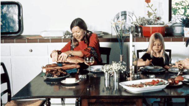 La escritora Joan Didion, sentada a la mesa junto a su esposo, el novelista John Gregory Dunne, y su hija adoptiva, Quintana Roo, en su casa de Malibú, California, en 1972.